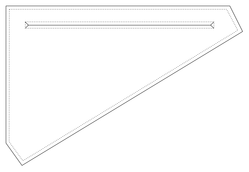 After cutting out my two triangles and perimeter strip, I started preparing the zipper hole. I decided against having four separate pieces joining the zipper (like the video) and opted for a single zipper slit, folding back the material to make room for the zipper. See sketch below (not to scale) illustrating the single slit method.